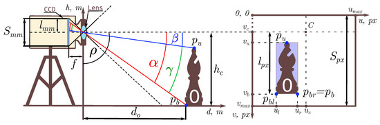 According to Figure 2, one of the bottom pixels of an object O is a point which has some coordinates in the image plane with resolution . An image principal point C has coordinates which usually correspond to a central pixel of an image.