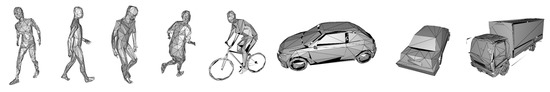 For each of the described classes, the 3D models (Figure 4) were generated based on geometrical parameters ranges provided in Table 1. The 3D models of the pedestrian are generated in various postures such as standing, walking and running. The instance of the group model is a combination of the pedestrian models located next to each other. The cyclist models are expressed in different postures of a driver, while the vehicle varies in car models.
