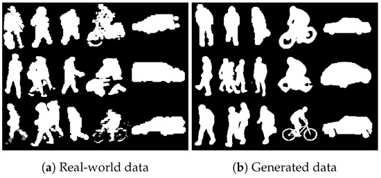 In order to gather features, the 3D objects are projected into a 2D image plane on the range of camera operation angles (0–80°) and heights (2–10 m) using the Pinhole Camera Model transformation. The 3D objects are rotated around to synthesize different movement angles. To increase the authenticity of synthetic data, a number of distortion techniques are applied, in particular, the motion blur effect has been added to simulate distortions of a real camera. The real-world data (Figure 5a) is used to validate the synthetic data. Obtained objects contours (Figure 5b) are processed by the feature extraction method.