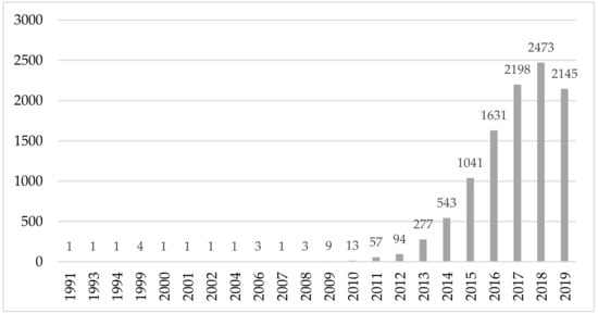 The “smart city” concept is becoming more popular in scientific literature and policy reports over the last two decades. A simple search of the “smart city” keyword appearance in the title of articles in Web of Science (WoS) as a scientific literature-indexing engine, revealed slightly over two thousand records as of 25 November, 2019. Figure 1 is an illustration of the publication growth trend of the “smart city” concept over the years, which is noticeable in the sharp growth of the terminology usage since 2012. The decrease in the number of publications in 2019 was because the search was undertaken prior to the end of 2019.