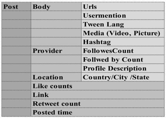 Twitter provides an application programming interface (API) to access tweets and information about posted content and users. The potential bias of the Twitter API has been discussed by recent research [60]. Twitter data have been used for a wide range of studies such as the stock market [61], brand analysis [62], and election analysis [63]. The unique characteristics and features of Twitter as a microblogging service are illustrated in Figure 3.