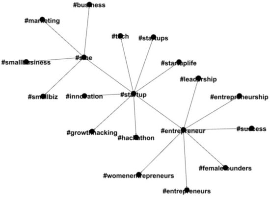 This phase attempted to collect relevant tweets using Twitter’s application programming interface (API) [67]. Based on the background literature, major keywords have been identified to capture entrepreneurial ecosystem activity in Twitter (e.g., Entrepreneurship, Startup, Innovation). Popular hashtag recommender toolkits were used such as “http://hashtagify.me, https://ritetag.com and “https://www.trendsmap.com to discover the relevant hashtags and their proximities to the innovation and entrepreneurial related discussions. The toolkits encounter the co-occurrence network of tweets, and accordingly their hashtags. Therefore, by inputting a keyword, the toolkits are able to recommend related hashtags based on their background information. Figure 4 illustrates the hashtags’ proximity with the subject of the initial search (#startup #startups #entrepreneur #tech #sme #innovation #entrepreneurship #startuplife #hackathon), which were obtained to detect the extended hashtags and relevant discussions.