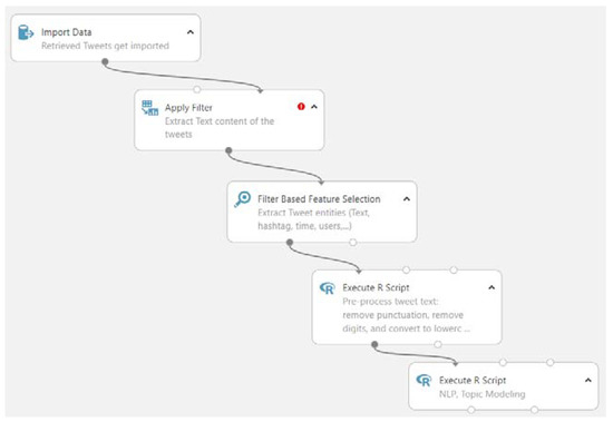 In this phase, the analysis of tweets was advanced by Data feature extraction and data classification. Regarding the SNSs data collected from Twitter, the investigations began with an empirical analysis of the dynamics of the discussions on Twitter. The topical structure of the discussions will be studied. Furthermore, the investigating will continue to extract the characteristics of the major content producers. The Twitter analytic process was facilitated by the Azure cloud computing platform [68], and the pipeline of the process can be seen in Figure 5.