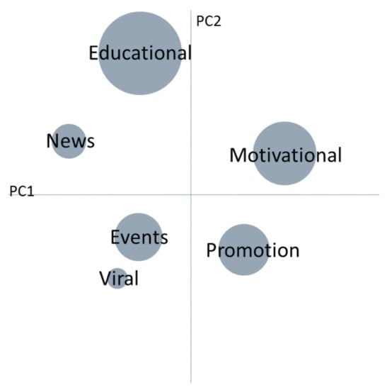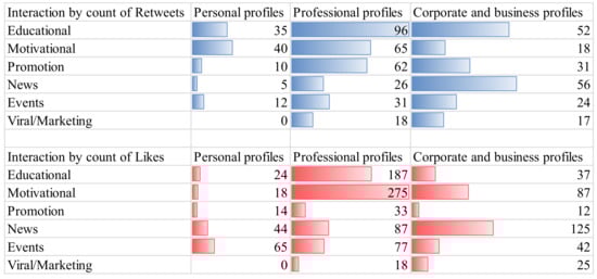 As can be observed from Figure 7, professional users have more influence overall. In topical content categories, professional users generate the largest influence in educational, motivational, promotional, and events types of topics. Corporate and business profiles tend to be more influential in the news, educational, and promotional categories after professional users. Counting the likes, the calculation revealed that professional users have more interaction, especially in educational and motivational content category, while business profiles had a higher interaction in the news category and motivational category in second ranking. Personal profiles have the lowest influence among the other two profile categories in both retweets and count of likes. The difference in the distribution of interaction is that the motivational and educational categories received the highest retweets and in the calculation of like counts, the high-interacted categories shifted to events and news.