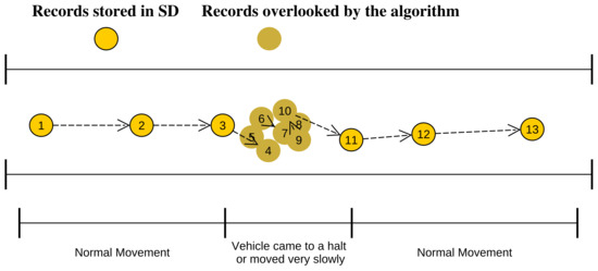 For the first data reduction technique, the system calculates the general traversal of the vehicle based on the last two recorded records. The system assumes that the vehicle has come to a stop when the distance d between these records is less than a specific threshold (the threshold in the presented system is set to m due to the inaccuracy of the hardware used ). The distance is calculated as which indicates the distance between the vehicle’s current position and its previous position . When the calculated distance is less than the defined threshold, the system discards the last record it collected. This comparison is executed repeatedly until the vehicle starts moving again. At the end of this process the system has kept only the first and the last record recorded on that spot. This data reduction technique is presented graphically in Figure 3 and the algorithm of this technique is presented in Algorithm 1.
