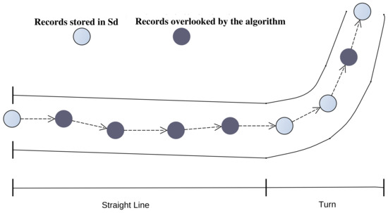 This data reduction technique is applied when the vehicle is moving on a straight course. As shown in the figure the system stores only the first and the last record collected on that straight course and discards the rest.