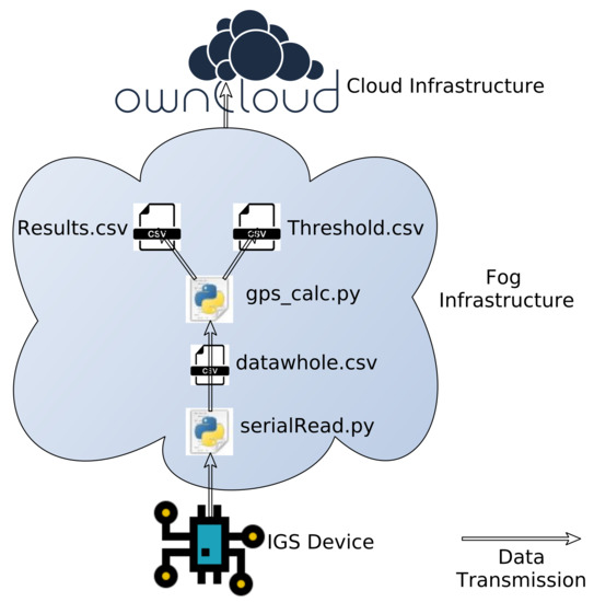 Each FD contains a directory which includes five (5) files in total (i) datawhole.csv, (ii) Threshold.csv, (iii) Results.csv, (iv) serialRead.py, and (v) gps_calc.py just as shown in Figure 5. Each directory synchronizes with the OwnCloud directory to keep the stored records up to date. In other words, the server is now able to merge the information of multiple IGS devices into one file. Apart from the files where the data and the information is stored, each directory includes the scripts used by the FDs to collect the data and extract the information needed. More precisely the file named datawhole.csv contains all the raw data collected by the IGS devices. The file named Threshold.csv includes all the previous speed records which the system uses to compare the calculated average speed and describe the state of the vehicle. All the information extracted by the system is stored in the file named Results.csv. Every FD runs both ’.py’ scripts as presented in Figure 5. The script named serialRead.py monitors the serial communication with the IGS device and stores data during every MTS-IGS communication. The second script is named gps_calc.py and it is responsible for extracting the information needed and saving it in the file named Results.csv.
