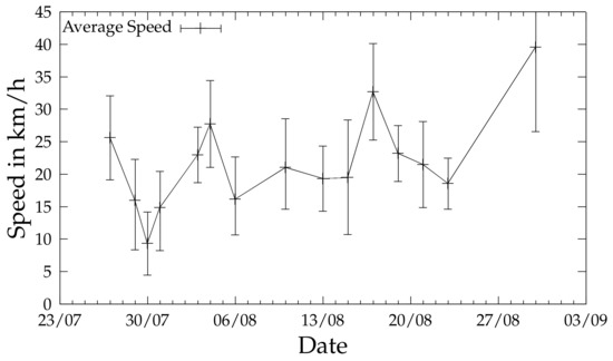 where i points to one of the dates selected and j points to the speed records of that . Based on the professional drivers’ traffic estimations, the busiest time of the season starts around the end of July and ends around the 21st of August. Their testimony is confirmed by the data recorded during that period. As seen in the Figure 7 the recorded average speed of the vehicles until the 21st of August ranges between 15 and 25 km/h. From that point on the speed keeps increasing slightly since the busiest time of the season has ended and the center of the town is not as crowded as before. By the beginning of September the speed is already significantly higher, compared to those of the aforementioned dates.