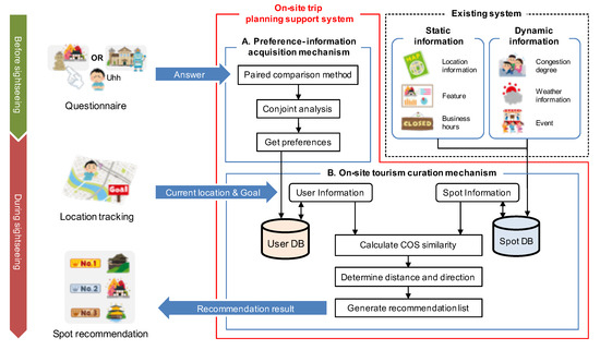 To construct an on-site trip-planning support system that efficiently recommends the next spot, the system must have the following improvements over the existing systems: (Condition 1) It must be on site; (Condition 2) it must be sensitive to the tourist’s preferences and dynamic information; (Condition 3) it must acquire preferences while imposing a small burden on tourists.
