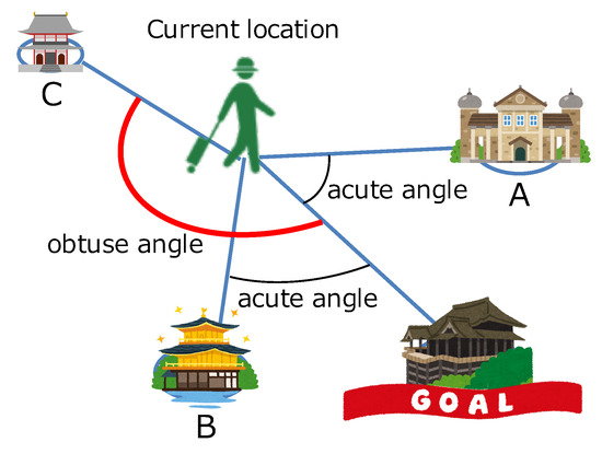 - Be in a direction opposite to the direction from tourist’s current location to the goal locationWhen the angle between the tourism spot, current location, and recommendation candidate goal point is obtuse (more than 90 degrees), it is regarded as a tourism spot that exists in the opposite direction of the goal point, and is excluded from the list. For example, candidates A and B shown in Figure 2 are recommended candidates, but candidate C is excluded.
