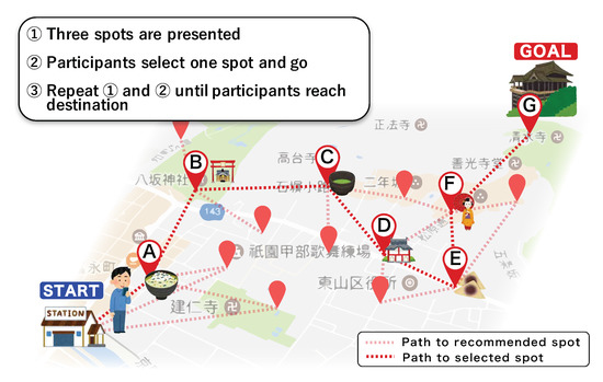 For example, it can easily be assumed that congestion at major tourism spots results in it requiring a longer time to see them than expected, or that events scheduled on a rainy day are likely to be canceled. In such cases, tourists must spontaneously change their plans. Tourists sometimes do not acquire a detailed plan of how to get around an area’s tourism spots before they begin sightseeing [7]. That is, many tourists know only the main spots that are popular. When a change is needed to select the next spot to visit, they must collect information on other spots while taking into account routes, time zones, weather, congestion, and personal preferences from the sightseeing they have experienced so far.