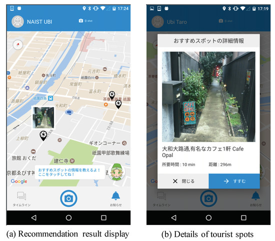 Through the evaluation experiments in Section 5.1 and Section 5.2, we confirmed the effectiveness of the proposed system. However, regarding the design of the experiment in Section 5.1, for safety reasons, we first conducted Experiment 1 (with recommendations for tourism spots) and then conducted Experiment 2 (no recommendations for tourism spots). Therefore, in this experiment, we did not consider the bias due to the experimental order. To consider such a bias, we need to improve the experiment plan, such as by changing the order of experiments according to each participant. In addition, because all of the participants are students, the participants in this experiment are not representative of all tourists. Thus, in the future, we need to conduct the experiment with a greater number of people, with tourists with different attributes as participants. Furthermore, to further improve our system, we think that it will be necessary to propose not only tourism spots to be visited next, but also a method for creating a sightseeing plan that takes into consideration the balance of the sightseeing schedule. Specifically, rather than simply providing a set of tourism spots that are highly recommended for tourists, it will be more useful if temporal constraints, such as user schedule and venue closing times, are considered. For example, it is not realistic to always go to a restaurant during a day’s sightseeing, even for tourists who are usually more interested in eating and drinking than landscapes. It is necessary to consider satisfaction tradeoffs for tourists when choosing between multiple tourism spots. Hence, we think that it is necessary to collect data for predicting the next possible action of a tourist (e.g., satisfaction of the tourist [36,37], congestion status of tourism spots [38]) and construct a concrete model from this data to solve this problem.