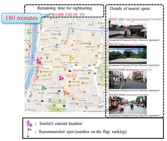 The preferences were acquired for each participant utilizing a preference-information acquisition mechanism combining the pair comparison method shown in Figure 5 and conjoint analysis. At this time, the degree of congestion of each tourism spot is taken into consideration by including the tolerance for congestion in the preferences. For example, a crowded tourism spot will not be recommended because it will cause a decrease in satisfaction with participants who dislike crowds. Next, using the acquired preferences, we simulated pseudo-tourism on a PC from Gion-Shijo Station to Kiyomizu-dera using the pseudo-tourism tool shown in Figure 6. In the pseudo-tourism tool, on the basis of user information and spot information, tourism spots are recommended (four in this case for the convenience of implementation) according to the on-site sightseeing curation mechanism explained in Section 4.3, and they are displayed on a map. Each recommended tourism spot is indicated by a flag, and the number in the flag indicates the recommendation ranking. On the right side of the map, details of the appearance and information of each recommended tourism spot are displayed in the order of rank from highest to lowest.