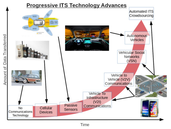 ITS-based crowdsourcing that takes advantage of the aforementioned infrastructure and its dense connectivity has the potential to provide a massive influx of new data for ITS operators to work with. The data influx will aid in a variety of verticals such as infrastructure design and improvement decisions, real-time navigation, safety system operations (e.g., traffic and collision monitoring), and will improve the interconnectivity of vehicles. Consider Waze—a traffic crowdsourcing system that allows users to provide information about traffic conditions, providing other users the ability to make more informed data-driven decisions regarding how to navigate along their trajectory safely and efficiently. While Waze is effective, it is limited by human data inputs, which may be inaccurate, suffer from a very limited useful time-frame, and require passengers to actually input the data to avoid unsafe distracted driving. By leveraging ITS and sensors on smart vehicles, data collection can be automated, increasing collection efficiency, volume, and data quality. Vehicular social networks can improve connectivity amongst ITS infrastructure, providing new channels for intelligent data dissemination [2,4]. The increased connectivity provides more conduits for data to be collected, improving performance of crowdsourcing systems. The improvement in ITS communications technology has lead to increased potential for the amount of useful information to be disseminated. This evolution in technological progress, visualized in Figure 1, started with an era of no communication between vehicles, to radio-based communications devices such as cellular phones, to integrating sensors within vehicles, then adding the potential for connecting the vehicle sensors via broadband connection to infrastructure, and formation of ad-hoc networks, with the final stage being autonomous vehicles that are capable of passively gathering data.