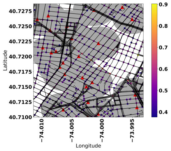 ITS technology powered by IoT devices such as embedded sensors in smart vehicles and new communications infrastructure stand to provide an untapped basis for mobile crowdsourcing applications from the exponential growth of inter-connectivity between all nodes of the overlaid communications network. The rise of 5G networks can lead to all sorts of high-bandwidth network topologies connecting smart vehicles in a VSN [2] (V2X), such as vehicle-to-vehicle (V2V), vehicle-to-infrastructure (V2I), vehicle-to-pedestrian (V2P), and vehicle-to-drone (V2D). See Figure 4 for an illustration of all of these communication paradigms working in concert together. A common challenge associated to the effective exploitation of ITS technologies to enable automated crowdsourcing tasks is its efficient infrastructure planning. In [22], we developed a smart placement of RSUs assisting crowdsourcing ITS infrastructure in a way to maximize the effective coverage of transmission architecture, while considering solar-powered RSUs and an amortized budget. We also developed heuristics designed to find a suboptimal configuration faster than solving a mixed integer programming problem [23] and to adjust RSU coverage to unexpected events [24]. Figure 5 shows RSU placement through our optimization framework. The aim of the framework is to determine an effective placement of RSUs in order to maximize the sum of the “demand” of all the covered points, where the “demand” could refer to any metric of interest for ITS planners, given an amortized budget consisting of periodic operational costs and amortized capital expenditures. In other words, this framework was purposely designed to be a general problem, so the “demand” metric can be freely changed based on the planner’s choice. In our example, we defined the “demand” as a normalized linear combination of randomly sampled data meant to represent traffic fluctuations, along with car accident data sourced from NYC OpenData (https://data.cityofnewyork.us/Public-Safety/Motor-Vehicle-Collisions-Crashes/h9gi-nx95). In our case, overall coverage efficiency is 92.5% given the provided by budget. The framework places RSUs to cover highly demand points of interest. The coverage of low demand points is a consequence of them existing in the same general region as high demand points. The placement of RSUs aids in intelligent infrastructure planning, providing increased connectivity. The improvement in the number and quality of connection gateways, along with smart vehicles armed with a dizzying array of sensors and increased autonomous driving capabilities, provide new means of collecting transportation-related data for ITS mobile crowdsourcing applications.