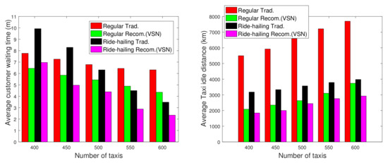 We illustrate a benefit of mobile and automated sensing crowdsourcing for ride-share recommendation systems in Figure 6. The proposed recommendation system utilizes automated sensing and mobile-crowdsourcing techniques to improve traditional ride-hailing and regular curbside ride-sharing services by introducing collaboration among drivers, improving quality of service by reducing customer wait time and wasted searching for new fares [25,26]. In this comparison, we evaluate the performance of the proposed recommendation system for both regular and ride-hailing taxi services. There are four cases: Two traditional taxi services without recommendations (Regular Trad. and Ride-hailing Trad.) and two taxi services based on our proposed recommendation system (Regular Recom. (VSN), and Ride-hailing Recom.). With VSN, the taxis can instantaneously share their data through the vehicular social networks, which allow drivers to have more knowledge about the customers’ demand and the traffic situation. We demonstrate around 10–15% reductions in customer waiting times for traditional curbside services, 20–25% reductions in waiting time for ride-hailing services, 60% reductions in extra distance driven by workers while searching for new fares in curbside services, and 25% reductions in extra driven distance by ride-share workers. This is a significant savings for both the customers and the taxi drivers that are exploiting crowdsourcing services through VSN.