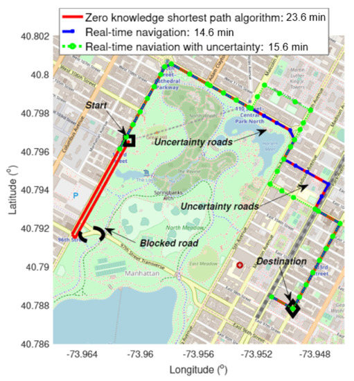 The work in [38] addresses the reliability scoring and automated crowdsourcing management problems in crowdsourcing-based real-time vehicle navigation where routes are continuously updates according to other workers’ feedback. Oftentimes, there is uncertainty surrounding the accuracy of data reported by workers in crowdsourcing systems. Figure 9 visualizes how accounting for uncertainty may influence navigation decisions. The red path corresponds to a traditional navigation following the shortest path taken by a driver, which has an obstruction that forces the driver to reroute. In [38], an algorithm designed to account for these types of blockages, automatically using other road users’ feedback, finds a new optimal path for the driver (blue path), and the green path is the optimal path when also attempting to minimize the risk associated with traversing along paths where the data collection is not as reliable. Hence, the crowdsourcing platform proposes to the driver to follow a longer route to avoid the risk to be trapped in a congested route due to its limited knowledge.