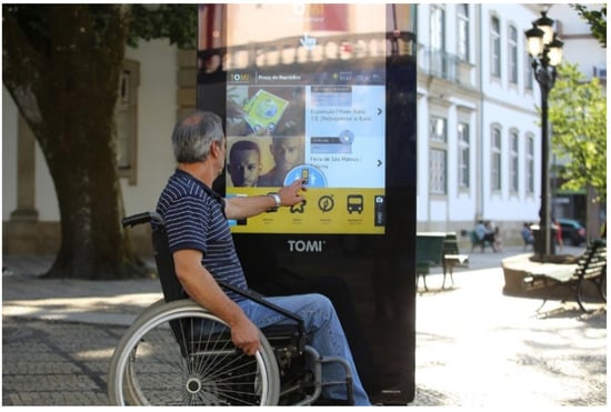 Another example is the smart bus stop prototype of Hungarian company Aquis Innovo in Budapest. The European Commission funded the design and development of the prototype (Figure 2). This prototype, which includes ticket vending, parcel delivery, passenger counting, passenger information, wireless, USB charging, bike rental, air conditioning, taxi ordering, tourist information, news, advertisements, weather forecast, reverse vending, surveillance and other services [20]. On the other hand, there are other smart furniture options, as the outdoor bus ticket-kiosk (Portuguese OEMKIOSK) or information providing smart furniture adapted to people with disabilities such as the Portuguese TOMI as shown in Figure 3.