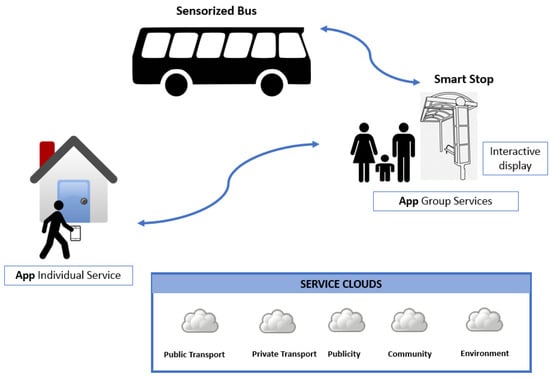 MUSA is a physical stop equipped with an interactive display (currently a 40-inch monitor provided with an infrared frame) and a computer system communicating with a set of cloud systems to provide different services to travelers at the stop. These services available in the stop are called Group Services (Figure 4).