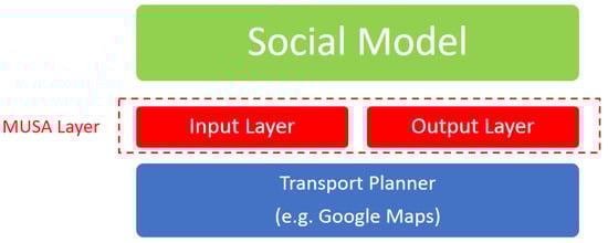 The multimodal trip planner employed in MUSA includes options for walking, cycling, private and public transport. It is designed as a special software layer (Figure 9) that can run on a commercial travel planner, such as Google Maps (and its API). This approach has three advantages: it allows the customization of interfaces for different users’ segments; as elderly people, it allows the anonymous collection of traveling data for building mobility models and developing social innovation solutions (Social Model in Figure 9); and finally, it can be adapted to different commercial planners.