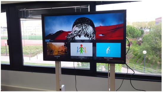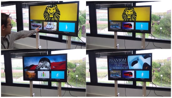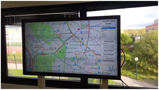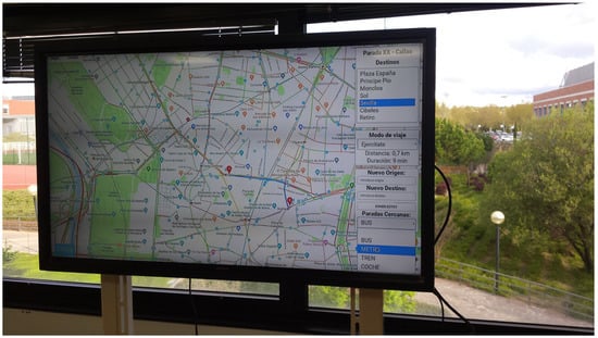 The current state of the prototype of the MUSA smart bus stop and its main interface are shown in Figure 11. An advertisement is running in the background (in this case, for musicals in the center of Madrid), while different services are available in the lower carrousel. For intuitively attracting users to different interfaces, two type of icons are available. A traditional picture is used to attract more resolute and direct users (e.g., some senior people). Let us call it the “conservative interface”. Moreover, a more playful icon is used to attract more skillful and playful users (e.g., some junior or young people). Let us call this the “playful interface”. Other future special services for assisting travelers with special needs (elderly, those with reduced mobility, easier travel with kids or pregnant women) are also included in the interface.