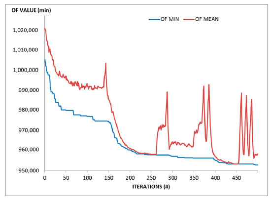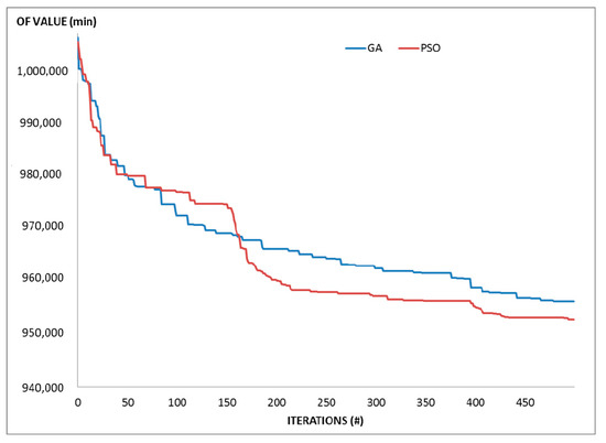 Figure 3 shows a straight comparison between trends of the GA and PSO OF minimum values. It allows to appreciate how PSO is more efficient than GA. The trend clearly shows that, after about the 150th iteration, the minimum OF value found by the PSO is lower than that of the GA. Moreover, this value is very close to the one reached by the GA in its last 100 iterations (from iteration #400 on). The results of the remaining scenarios confirmed the efficiency properties of the PSO algorithm.