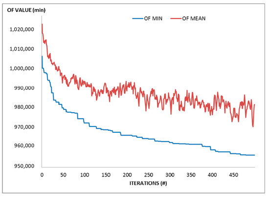 Among all the five scenarios, the lowest OF value was the one provided by applying the PSO to the scenario composed of 130 lines. It can be observed that the final OF value decreases as the number of lines in the transit network increases. This is due to the weights adopted for users and operator terms in the OF definition. For this scenario, a detailed comparison between the two algorithms is reported in the figures below: Figure 1 and Figure 2 show the trend of the OF minimum and mean value for the PSO and GA, respectively. The trend obtained by PSO algorithm is characterized by sudden increases of the mean value due to the speed updating procedure that adds random properties to the optimization method to investigate new valleys of the searching space without being trapped in local minima. Such high peaks are missing in the OF trend of the GA (Figure 2), underlining a smoother contribution of the random component to the search process.