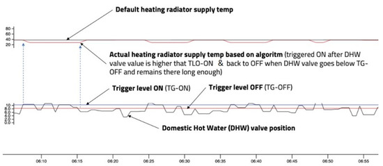 DH is also used for heating DHW. Since the heat is transferred from the DH network to radiators using a heat exchanger without any buffering capability, power peaks always occur when tap water is used. In addition, when there is high tap water use, e.g., many people are showering at the same time, there is a high power peak. These power peaks typically occur in the mornings and the evenings, but they may also occur at any time of the day, depending on inhabitants’ living profiles. Therefore, the DR is based on the sudden increase of DHW usage. The state (0%–100%) of the actuator valve for DHW is monitored and after a certain threshold value is passed, the energy for heating is reduced by restricting the actuator valve.