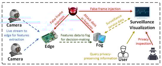 The smart surveillance relies on the authenticity of raw video streams from camera to fulfill features extraction and decision-making tasks. However, adversary can launch the visual layer attacks to pose a potential threat to safety and security of the infrastructure [35]. Through false frame injection, attacker can feed fake frames on edge to generate incorrect features. During the decision-making time, the attacker can also replace original frames with duplicate ones in decision-making process to reduce detection accuracy, as shown in Figure 1.