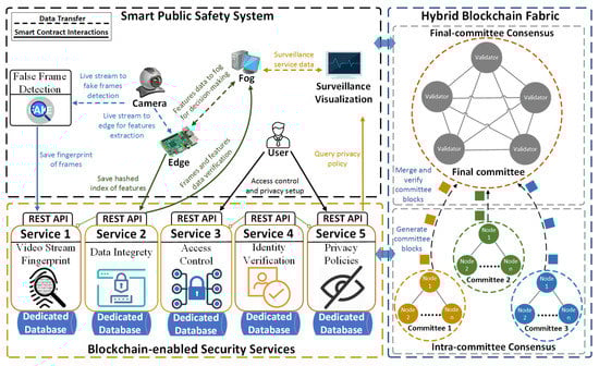 Being considered among the top concerns in the development of smart cities, smart public safety (SPS) facilitates the easy exchanges of surveillance data streams among data owners and third-party service providers. However, it also brings new challenges in architecture, performance, and security. The SPS relies on a distributed network environment consisting of a large number of IoT devices, and all participants uses their domain independent platforms with high heterogeneity, dynamics and non-standard development technologies. Therefore, system architecture should be scalable, flexible, and efficient to support fast development and easy deployment among participants [3,4]. In addition, to meet the requirements of instant decision making with high accuracy, geographically scattered edge devices collect data at local and share data among service providers of different domains. However, conventional security and management solutions utilize a centralized architecture, which can be a performance bottleneck and is susceptible to a single point of failure. Additionally, SPS combines on-line video stream data from the cameras and with data from off-line sources to perform smart surveillance tasks. Thus, the data in use should be consistent, unaltered, and audible through the entire lifetime. Given a trustless distributed IoT network environment, an ideal SPS framework should be able to support decentralization, immutability, and auditability to ensure security and privacy-preserving data sharing and service operations.