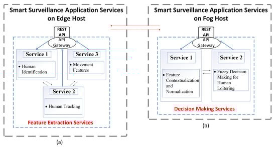 Smart Video Surveillance Microservices: (a) Services at Edge; (b) Services at Fog.