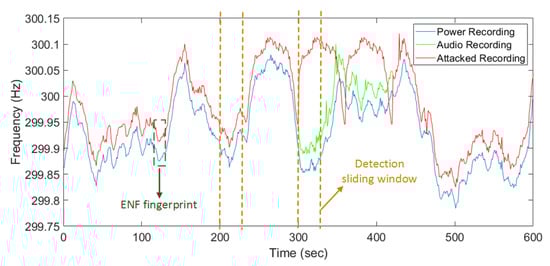The estimated signal from both the power recordings and the audio recordings from the surveillance system are compared using correlation coefficient [40]. We adopt a sliding window-based mechanism to achieve an efficient online detection task. For each window, a 30 s recording is used for ENF estimation, and upon correlation comparison, a step of five seconds is used with an overlap of 25 s. The sliding window approach can reduce the delay in detection of the replay attack and consumes less computational power. As Figure 4 shows, the ENF of duplicated recordings is mismatched with the ENF of power recordings as sliding window comes, the correlation coefficient for duplicated recordings will drop and the false frame injection attack is detected. Readers interested in a detailed study of ENF application in digital media forensic analysis are referred to the work in [36].