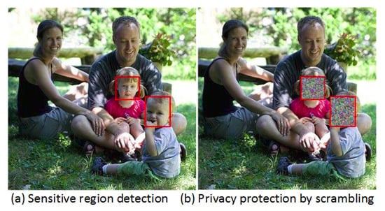 To enable surveillance visualization without violating the privacy of individual person captured in the videos, a privacy preserving mechanism is designed by integrating lightweight sensitive privacy-attributes detection methods, scrambling technique and blockchain technology. The non-compute intensive object detection algorithm is responsible for classifying and localizing those objects on video frames which are deemed sensitive. Then, the scrambling technique reversibly masks those sensitive objects or regions detected by the object detection scheme. To illustrate how privacy preserving mechanism works, we use a test picture from the images of groups dataset [41]. Figure 5 presents an example of children privacy protection. Figure 5a shows that children’s faces are accurately detected and bounded through a face-detection algorithm. In Figure 5b, the faces of the two children are enciphered following the scrambling process to hide their identity in case of unwarranted disclose. Readers interested in a detailed study of face identification and scrambling technologies for privacy protection are referred to the work in [39].
