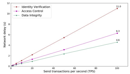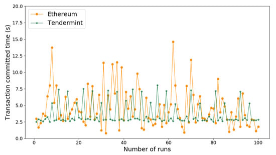 Figure 10 shows the time delay, that a node launches a blockchain transaction () and waits until it has been committed on the distributed ledger. The committed time is closely related to the block confirmation time that is defined by the consensus algorithm. Tendermint utilizes a BFT consensus protocol to achieve a deterministic finality on a new block for each voting round, so that committed time is almost stable (~2.9 s), as showb by Figure 10. However, Ethereum relies on a random block generation mechanism defined by the PoW consensus protocol, and it achieves a probabilistic finality on committed data on the distributed ledger. Therefore, the committed time of Ethereum is greatly varying owing to variable block confirmation time as illustrated by Figure 10.