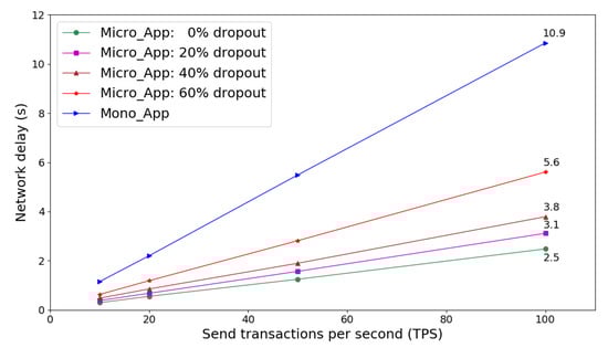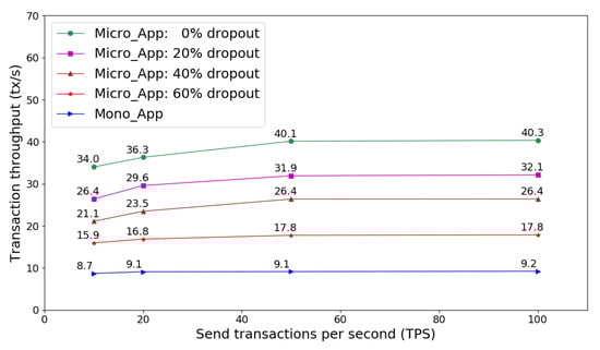 Figure 9 presents the transaction throughput that Micro_App and Mono_App can achieve as TPS increases. The transaction throughput is greatly influenced by network communication capacity and service processing capability that a security microservices host machine can provide. As Mono_App uses a single monolithic application node to handle all security service transactions, transaction throughput is easier to become saturate than Micro_App as TPS increases. Figure 9 shows that transaction throughput ascent of Micro_App with 0% dropout becomes flat when TPS is about 60, however, Mono_App cannot dramatically increase transaction throughput as TPS is larger than 20.