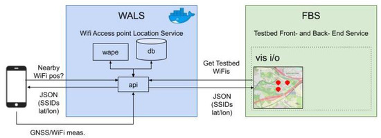 High-level WALS (Wi-Fi Access Point Location Service) service description, showing the interaction of the service with the front-end.