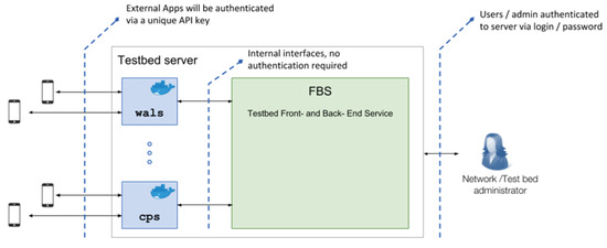 The Front-end and Back-end (i.e., FBS service) is hosted in the central server of the testbed. It is connected with every positioning service of the testbed and communicates with them in order to provide the necessary input data (input parameters, setup, etc.), as shown in the scheme in Figure 6. It also receives the output data of each service and processes it accordingly to the different application requirements (displaying data, configuration, and geographical information of services).