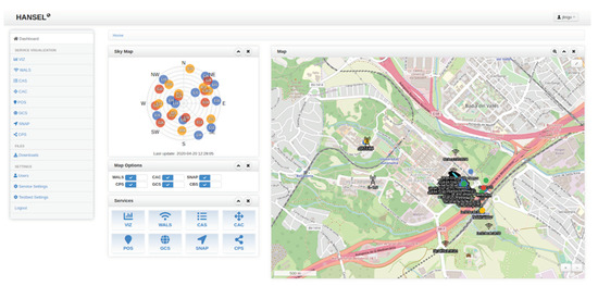 The orbit service is in charge of providing the visibility status of the testbed in terms of GNSS satellites. It routinely fetches the most recent broadcast ephemeris that contains the orbital parameters for all satellites of the GPS, Galileo, Beidou, and GLONASS systems and generates the information to display the satellite visibility in terms of azimuth and elevation angles (so that a skyplot can be plotted). A skyplot can be generated according to any input reference position provided by the testbed operator or it can be generated according to the testbed location. The HANSEL testbed is indeed equipped with a high-end GNSS receiver to provide local observations and measurements from the testbed location.