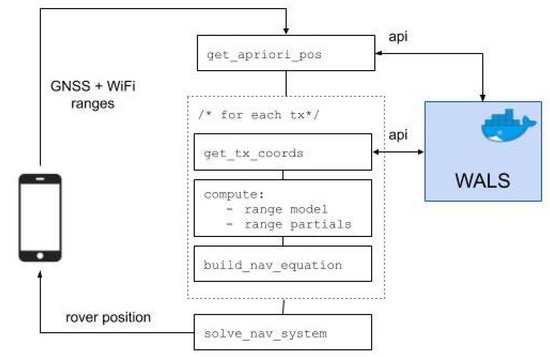 In order to exploit Wi-Fi™ routers for navigation it is necessary to know their location. Wi-Fi Access Point Location Service (WALS) is the service that ingests data points from an external application (described in further sections) and routinely computes those positions. Then, a rover receiver wishing to use a certain Wi-Fi Access Point (WAP) to navigate will query this service to know the location of this WAP. A system-level description of WALS is shown in Figure 2.