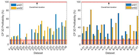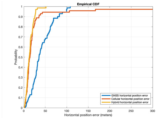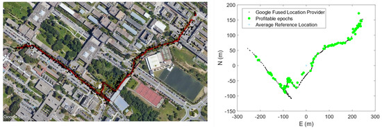 It accounts for the percentage of epochs in which the hybrid solution provided a better estimate (lower MSE) than the GNSS-only solution, both compared to the GFLP (self-assessed through the CPA). Figure 13 presents a qualitative view of the promising amount of profitable epochs in a sample experiments at UAB campus. Figure 14 shows the 3D profitability of the experiments belonging to each test campaign.