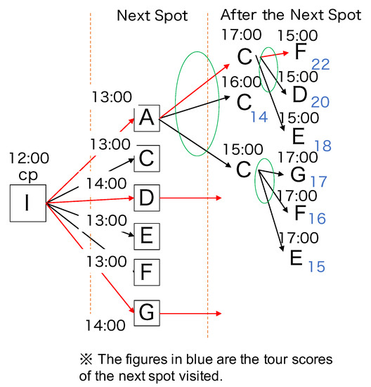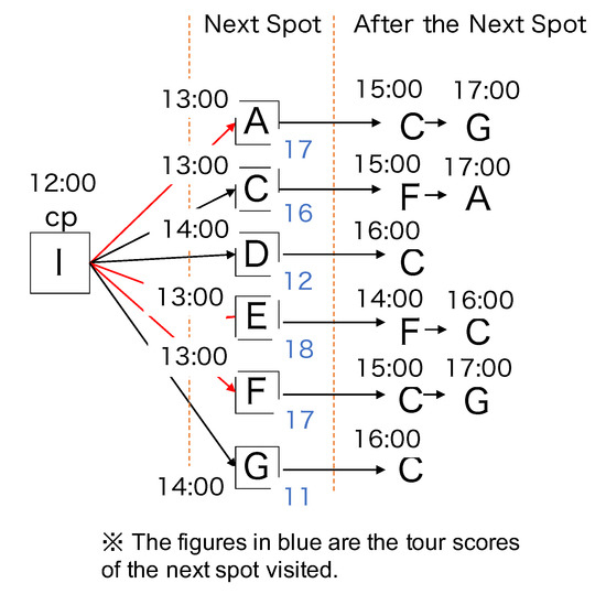 To illustrate Algorithm A, we applied it to the assumed environment described in Table 3. At the start, the user’s location is {12:00, I}. Algorithm A first calculates the evaluation value considering the travel time to each spot in the unvisited spot set . For example, if the tourist next visits spot A, i.e., {13:00, A}, the satisfaction score is 7. This is stored as {13:00, A, 7} in Z, the list of spots to be visited. Next, considering the time spent in {13:00, A} and the time spent traveling to each possible next spot, the maximum value of 6 occurs for spot C at 15:00. Thus, {15:00, C, 6} is stored in Z. Finally, considering the time spent in C and the travel time to each possible next spot, the maximum value of 4 occurs for spot G at 17:00, which means {17:00, G, 4} will be stored in Z. The tour ends with the time spent at {17:00, G}. The total satisfaction level stored in Z is thus 17. This is the tour score. Ultimately, the tour score for each spot in each unvisited spot set is calculated, and the top three tour scores are presented to the user.