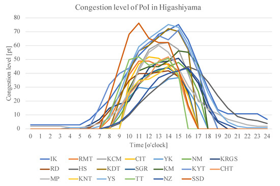 Congestion level of 20 PoIs in Higashiyama.