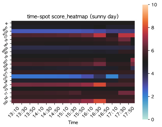 The heatmap of the total score calculated from the static and dynamic scores for each spot at each time is shown in Figure 8. The results in Figure 8 show that the scores for the outdoor spots at each time of the day are smaller than the heat map (Figure 6) for the sunny day. On the other hand, the indoor spots (KM, KCM) showed a larger score.