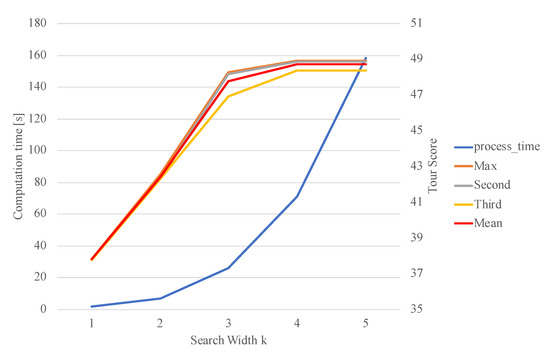 In the example above, the search width in Algorithm C was set to . To test the effect of the search width, a variable search width was considered. Figure 7 shows the computation time and tour score (overall tour satisfaction) when the search width k is assigned values between 1 and 5. As can be seen, the computation time increases exponentially with increasing k, while the tour score increases roughly linearly and then saturates. The reason for this is that, as the search width increases, more combinations of spots and time periods that can be visited in the future are searched.