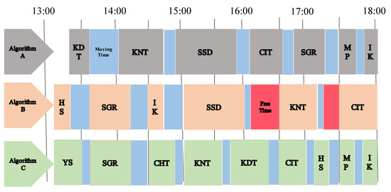One of the reasons that the tour scores of Algorithm B turned out to be inferior to those of the two other algorithms is the presence of substantially more free time in the Algorithm B result, as indicated by the red areas in Figure 9 (note that Figure 9 shows only the highest scoring route for each algorithm). As shown, the total free time in the Algorithm B result is 30 min, whereas there is no free time at all in the results of the other two algorithms. Unlike Algorithm B, where the search width is 1, Algorithm C uses a search width of 3, which reduces the problem of fragmentation encountered by Algorithm B.