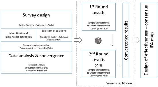 The indication of the effect of a Delphi survey is the amount of convergence caused by the iteration process, where convergence signifies how much more agreement is achieved on succeeding rounds as opposed to the first-round response [59]. Convergence is measured through established criteria which are subjective and relevant to the scope of a survey [62]. As datasets are not strictly symmetric, the convergence will be measured by the IQR; however, the MAD (Equation (1)) is also calculated to see if there are any mismatching results due to the selected method. IQR is the measure of dispersion for the median and consists of the middle 50% of the observations. Thus, an IQR of less than “1” means that more than 50% of all opinions fall within 1 point on the scale. IQR is a robust estimator that typically has inferior statistical efficiency compared to conventional estimators for data drawn from a distribution without outliers (such as a normal distribution), but has superior efficiency for data drawn from a mixture distribution or from a heavy-tailed distribution, for which non-robust measures such as the standard deviation should not be used [62]. Given the 1–5 ordinal scale of responses in the current study and its interpretation in terms of effectiveness, the adopted threshold of consensus was set to IQR ≤ 1.