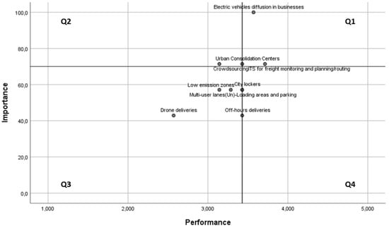 In the initial analysis of Martilla and James [72], the first quadrant (Q1) hosted services or products that are performing well, while at the same time are considered important by the customers. Respectively in this study, UFT solutions lying within Q1 are appropriate for implementation upon solution selection process, as they combine high effectiveness and consensus. Q2 area contains solutions (here only crowdsourcing) that stakeholders rated unanimously as least effective; thus, solutions in the Q2 area are considered inappropriate. Likewise, in the Q3 and Q4 areas lay solutions in which consensus has not been achieved, and thus suggestions for selecting them cannot be supported, no matter how effective they are considered. Finally, some studies highlight the difficulty to interpret attributes close to the threshold lines [75,78,79], as a slight change can lead to opposite suggestions. Such an ambiguous solution in this study is Urban consolidation centres.