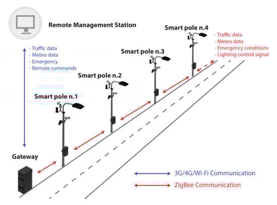 The system architecture (Figure 3) exploits local and remote communication channels. The local communication channel allows data exchange amongst the smart poles. On the other hand, the remote communication channel enables the data exchange between the smart poles and the remote server and, consequently, allows the centralized consultation of the collected data (i.e., power consumption, traffic condition in different streets, weather conditions and so on).
