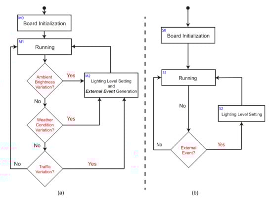 Figure 2 shows the flow charts representing the operating procedure of master (a) and slave (b) poles. In detail, after the initialization step, following the operating procedure the master pole holds the current lighting setting until a change in either the ambient brightness or the weather or traffic conditions is detected. In such case, according with the new conditions, the master pole sets a new lighting level and generates an external event that is shared with the slave poles via the local communication channel. On the other hand, the slave pole holds the current lighting setting until an external event is received. In this case, the lighting level is updated according to the master pole command.