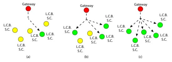 The network exploits various routing policies for the exchange of messages (command or information requests) between smart poles. In such way, as shown in Figure 4, the gateway can send information-requests/commands to a single smart pole (unicast routing), a group of smart poles (multicast routing) or all smart poles connected to the network (broadcast routing).